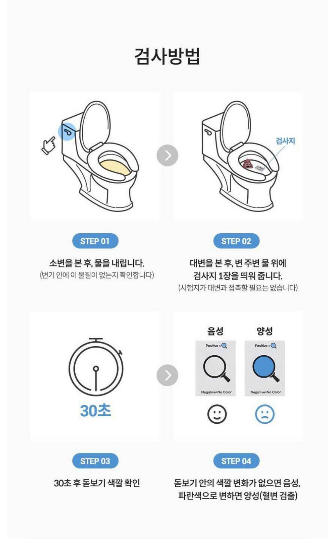 - 양성/음성 확인 → 양성 시 대장내시경 등 추가검사