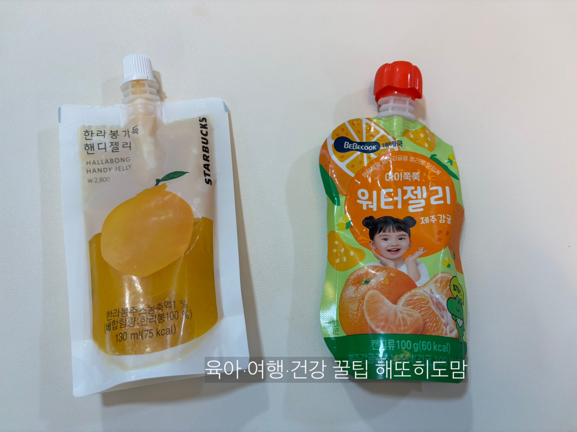 그래서 최근에 스타벅스 한라봉 핸디젤리와 베베쿡 제주감귤 워터젤리 두 제품을 직접 먹어봤어요.