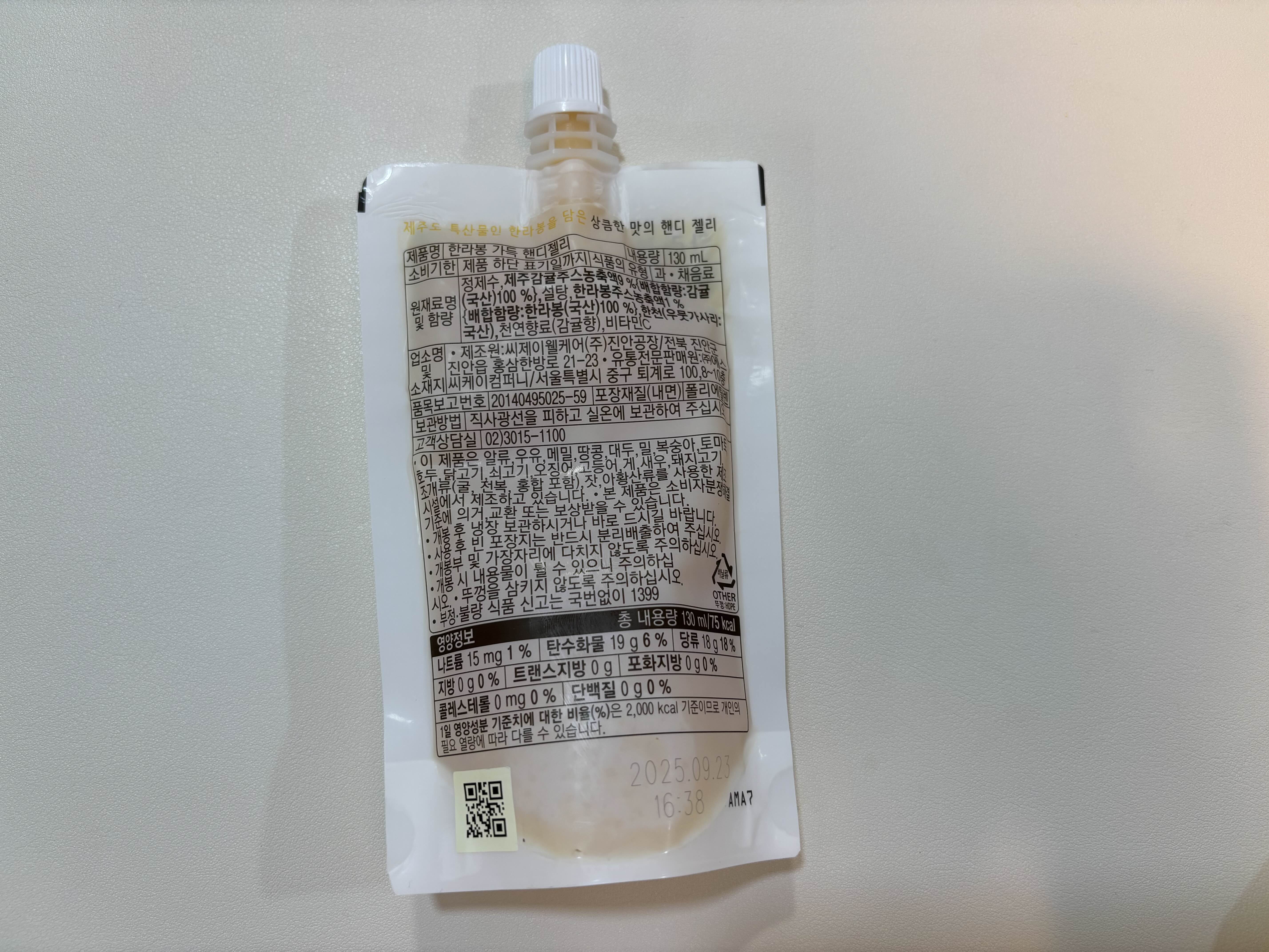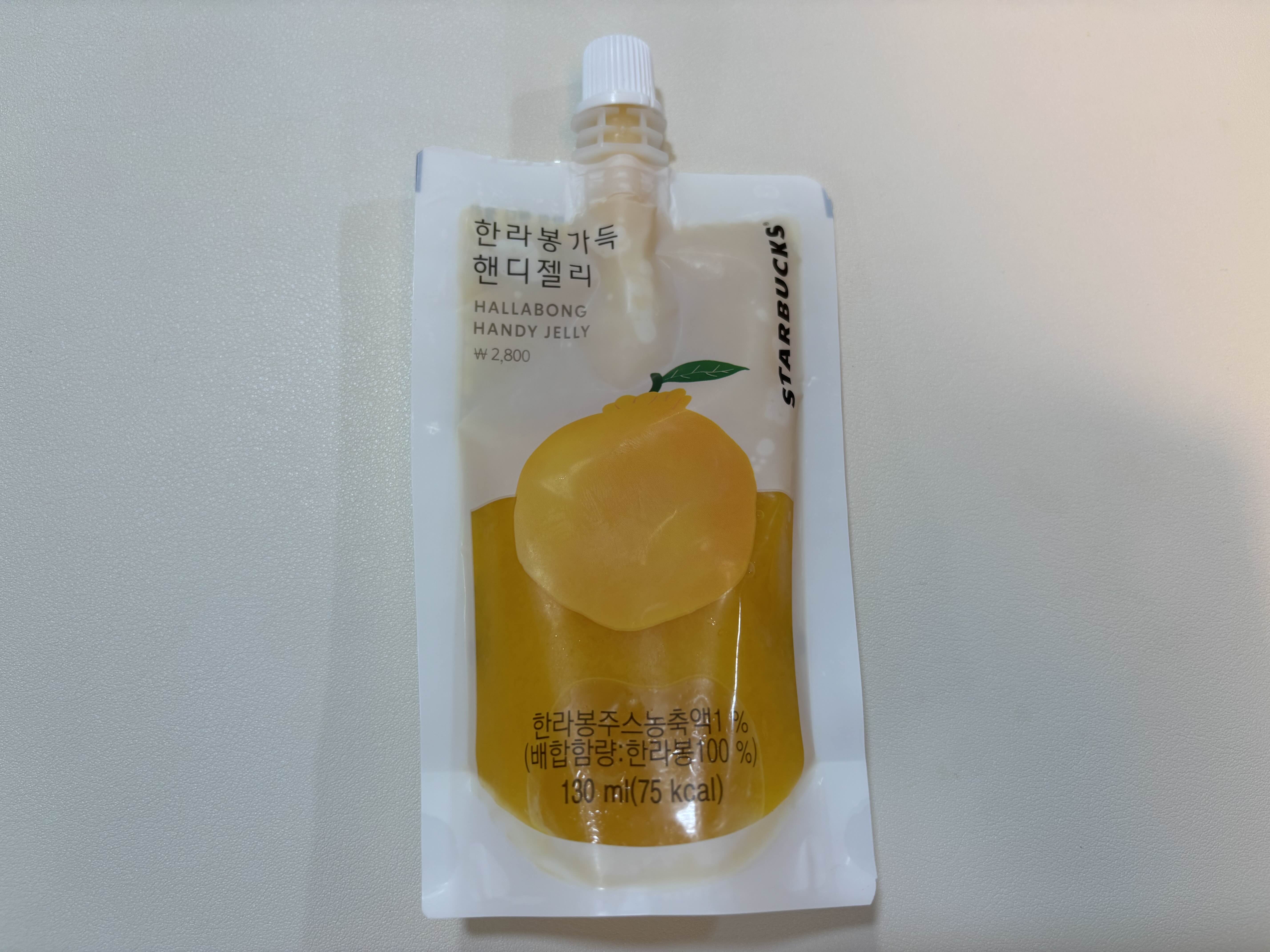 먼저 스타벅스 한라봉 핸디젤리는 130ml 용량에 75kcal이고, 한라봉 주스 농축액이 1% 들어 있어요.