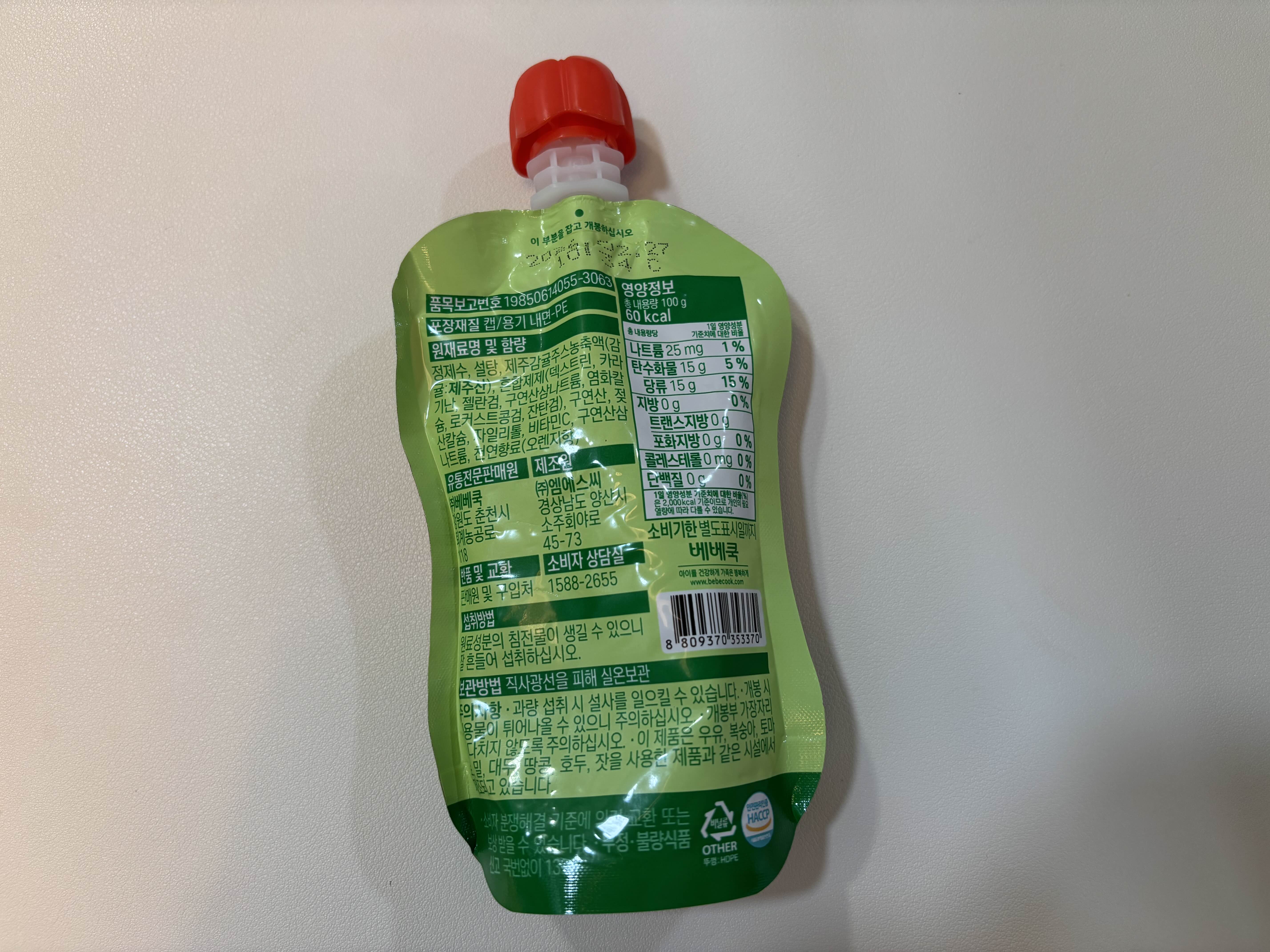 반면 베베쿡 제주감귤 워터젤리는 100g 용량에 60kcal이고, 감귤 주스 농축액이 3% 들어 있어요. 당류는 15g으로 스타벅스보다 조금낮습니다. 유통기한은 제조 후 약 2년 가까이로 꽤 넉넉해요. 또 빨간색 안전캡을 사용해 아이들이 삼키지 않도록 배려한 점이 돋보였어요👍🏻